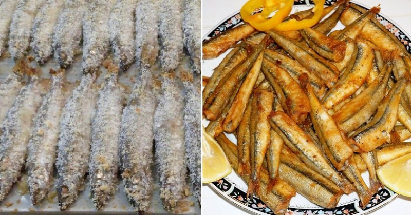 После на противень укладывают лист пергамента и аккуратно раскладывают мойву, предварительно убирая излишки панировки. Запекают рыбу при температуре 180°С в течение 15 минут.